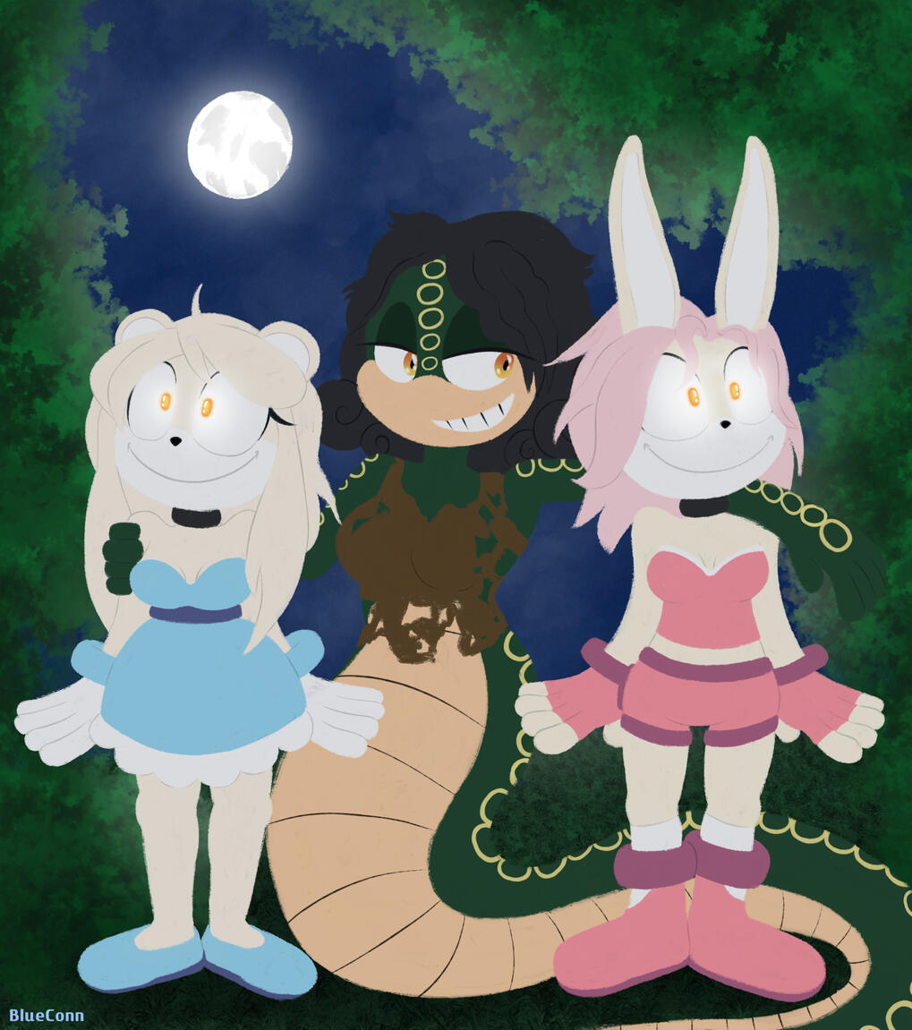 Immediately after that conversation, Carey stops the group, as they have found the hut from the reflecting pool’s vision. Spectrum congratulates Carey on her work, recognizing how she’s been leading them through the new landscapes with ease, but Carey doesn’t seem to respond like how Spectrum thought she would, much to his confusion… Despite this, the group opens the door and enters the building, quickly realizing that it’s bigger on the inside. The group sneaks through the hut and eventually make their way to a larger room, where they hide behind a corner and watch a snake-like figure yell at Marina to reveal how to get into the Sol Dimension. The figure is only met with silence from Marina, and so she becomes more urgent and loud as she starts to violently shake Marina. While holding Amy back (as she wishes to rush to her twin sister’s aid more than anything else at the moment), the rest of the group is quick to note how Marina seems to be in some sort of trance, with her persistent blissful smile accompanied by glowing orange and yellow pupils while she’s coiled up in the figure’s tail.As the group continues to watch, Carey and Priscilla suddenly stand up straight and mechanically step back, their faces becoming obscured in the shadows, all while the others are too focused on watching the scene in front of them to notice. Spectrum then says that they will descend upon Marina’s captor on the count of three, but immediately after Spectrum says one, Priscilla and Carey suddenly push the rest of the group into the room, causing them to yelp as they crash to the ground. This alerts the figure’s attention, who quickly turns around to face the intruders from the shadows, as well as to quickly wrap up Amy with her coils (having her squished up against Marina) before her friends can react. The figure slithers out of the shadows and reveals her unobscured form, remarking on how Amy looks so much like Marina. After comparing the two, the figure concludes aloud that her “little helper” captured the wrong person (with this new figure having gotten the two confused based on appearance alone), and she thanks someone unknown for bringing her exactly what she needed. As the group stands back up and reorients themselves into defensive stances, they ask who they apparently delivered Amy to. The figure obliges the intruders’ curiosity, revealing herself to be known as “Lamia,” while also correcting them by revealing that she wasn’t actually talking to them; instead, Lamia refers to people who are apparently behind the group, and they instinctively look behind to see Priscilla and Carey mechanically step out from the shadows, their faces hosting wide blissful smiles while their pupils glow orange and yellow (their friends quickly note how similar they look to Marina at that moment).Spectrum suddenly remembers Carey almost being sucked into the reflecting pool days earlier, quickly realizing that Lamia must have brainwashed her, and he naturally questions her about this with a fury. Lamia slyly and sadistically confirms to Spectrum that she indeed hypnotized Carey, calling it “a gift bestowed onto her” that she now “bestows onto others” before she congratulates Carey on inducting Priscilla and luring her friends into Lamia’s home. Spectrum gets more silently furious over Lamia toying with his friends as he preparedly grips his Wispon’s handle, and he asks what the point of all this is for her. Lamia teasingly doesn’t want to tell Spectrum anything about her plans, and she also notes (as if to clarify) that she especially doesn’t want to explain anything to “a scummy man,” which sends Spectrum over the edge.Spectrum suddenly strikes Lamia across the face, and his friends spring into action in response to their leader’s sudden attack; Berri and Tumult come to Spectrum’s aid as they assist him in fighting Lamia, all while Sonic tries to free Amy and Marina, and all while Whisper and Audrey try to fend off and even wake up Priscilla and Carey. While Lamia is busy fending off Team Spectrum, she uses magic to summon plants to help defend herself, all while swinging her tail around to try to throw Sonic off and to keep Audrey and Whisper from breaking Priscilla and Carey’s trances (all with a scary level of focus). Despite Lamia’s attempts to shake him, Sonic manages to slip Amy and Marina out of her coils, but she is unable to get them back as Team Spectrum continues to overwhelm her, forcing her to whip her tail at them with a scary amount of strength. While all of this is happening, Amy manages to wake Marina up from her trance, being initially groggy before she realizes what’s happening, being confused about how she got there while still being happy to see Amy there with her; as she and Amy embrace, Marina looks around and notices how Amy brought her friends to help rescue her, and she comes to realize (with a surprised and grateful awe) the lengths that they all would go to for her.Amy then shouts at Spectrum that they have secured Marina, which prompts Spectrum to call for a retreat, and the entire group responds by making a break for it. Before they can all make it to the entrance though, Lamia’s tail quickly wraps around Marina and pulls her back, much to her screams and Amy’s horror. As Amy tries to get back to Marina though, Priscilla and Carey block her attempts, and her friends are unfortunately forced to restrain her and continue their escape… After they’ve managed to escape the hut, everything calms down as Lamia has Priscilla and Carey come closer. Lamia then remarks on how it doesn’t matter that their intruders have escaped just now, as she still has the means to bring them back (saying this as she caresses a terrified Marina in her coils). Despite this advantage, Lamia notes how it doesn’t hurt to have a little insurance, and she chuckles evilly as Priscilla and Carey lean in on both sides of Marina…