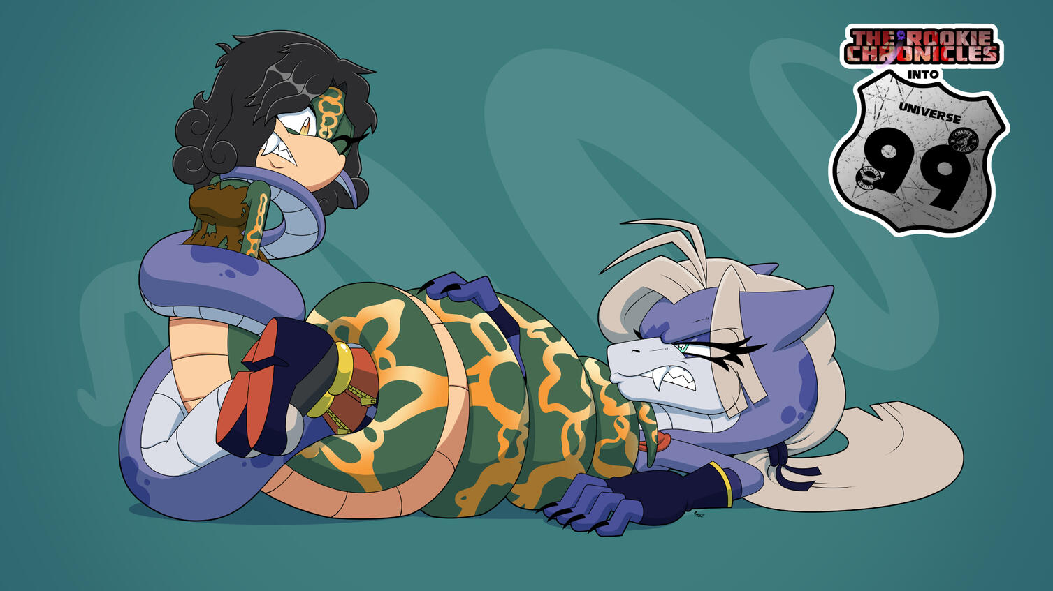 As she starts to feel her mind slipping in Lamia’s alluring eyes, the snake uses her tail to grab her glass cutter gadget from underneath her black sash, slicing away the large vines and freeing herself so that she can kick Lamia back, thus preventing her enslavement. In retaliation while Lamia is recovering, the snake throws a bola at her, wrapping around Lamia’s arms tightly and swiftly in the hopes of preventing her from using her magic, though that is quickly disproven when Lamia suddenly summons another large plant that swiftly sends the snake flying backward. Lamia then slips her tail through the bola and breaks it apart with her strength, only to quickly lunge at the other snake and wrap her up in her tail, using this as another opportunity to attempt hypnotizing her; the other snake, however, quickly wraps her own tail around Lamia, pushing them apart and keeping her at a distance as they engage in this new strangling match. After a few moments of them constricting each other, the other snake rolls them both off the roof of the museum, sending them falling into the alleyway below.In the alleyway, two police officers are in the middle of conducting a welfare check when the two snakes crash down, hitting a dumpster before finally landing on the ground. Being startled by this, the two officers approach Lamia and the other snake, ready to arrest them both for disorderly conduct and possible assault (on each other); the other snake gets up and looks at the officers, getting annoyed at their sudden appearance while also realizing how bad this situation has become, thinking that she could possibly be caught for the first time here, only for Lamia to get in front of her and blow the officers back with her magic. Instinctively, the officers draw their weapons and prepare to fire, prompting Lamia to look at the other snake and silently suggest working together to take them out, which she (also silently) agrees to. As the officers then fire upon Lamia and the other snake, they both dodge and weave in order to get close enough to retaliate; the other snake takes on the male officer, evading his gunfire and getting close enough to bite him on the neck and inject him with her venom (paralyzing him), while Lamia summons more plants to constrict the female officer, allowing Lamia to (successfully) hypnotize her after that.Once the dust settles, Lamia takes the opportunity to compliment the other snake’s abilities, noting how they’re so similar to her own, but the other snake tries not to respond much as she starts walking away. After a few steps though, Lamia stops the other snake in her tracks, trying to ask her about what she was doing up on that museum roof, only for her to try walking away again without much of a response; this time, Lamia stops the other snake again by saying that she was obviously gonna rob the place, making her freeze before turning around and asking Lamia to keep it to herself or else. Lamia instead suggests that she can help the other snake, noting how well they worked together just moments before when they were fighting the cops, saying how much greater their opportunities will be once their power doubles. The other snake actually ponders this request, taking both their previous fight and their short team-up into consideration alongside Lamia’s words, eventually deciding to accept the proposal with reasonable caution; with a partnership having been formed, Lamia and the other snake finally introduce themselves to each other, with the latter revealing herself to be known as “Noxia The Viper.” After that, Noxia suggests they return to the museum’s rooftop and break in stealthily (a method that she was actually preparing before Lamia interrupted her), but Lamia proposes a different strategy, saying that they can go all out and make a scene out of it…